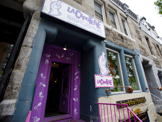 Tout le monde à Montréal connait la Capoterie ! Difficile en effet de manquer le gros logo en forme de capote, et les petits spermatozoïdes blancs peints sur le mur violet de cette petite boutique lovée dans la montée de la rue St-Denis.