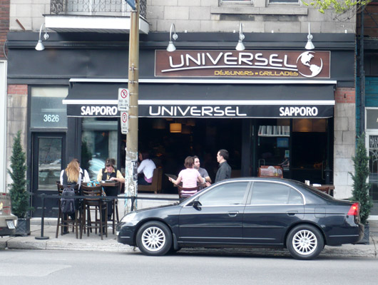 Sur les conseils de Anne-Lise, j’ai testé ce matin l’Universel, à l’angle Cherrier/St-Denis. Ce fut une très bonne surprise ! J’ai pris comme mon « chum » le petit-dej universel, moi avec du pain doré (= pain perdu) aux bleuets, et lui avec des gauffres fraise/banane (quel gourmand!)