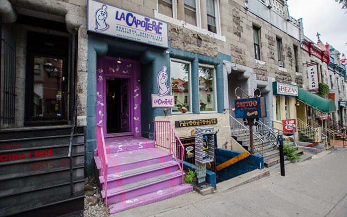 Tout le monde à Montréal connait la Capoterie ! Difficile en effet de manquer le gros logo en forme de capote, et les petits spermatozoïdes blancs peints sur le mur violet de cette petite boutique lovée dans la montée de la rue St-Denis.