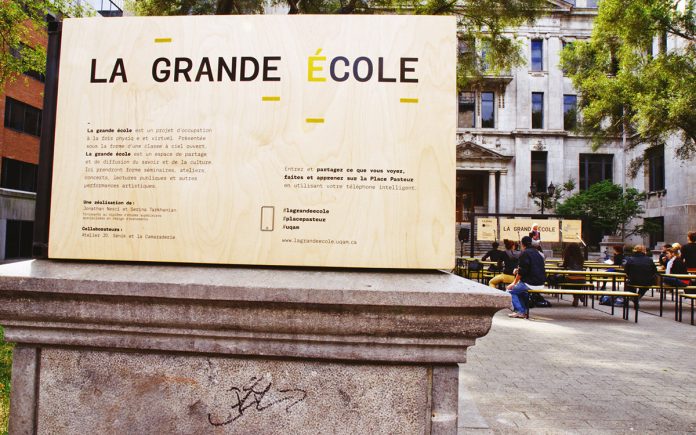 Pour la quatrième année consécutive, la place Pasteur accueille la Grande École, une installation éphémère qui propose séminaires, festivals et performances. Jusqu’au 2 novembre, cette classe a pour ambition d’être un espace de partage et de diffusion du savoir et de la culture. Sur l’estrade se succéderont des groupes de musique, des acteurs de théâtre et même des professeurs de l’UQAM qui viendront y donner des cours ! Les visiteurs sont également invités à venir y faire des photos et à les diffuser sur Instagram ou Twitter en utilisant les hashtags #lagrandeecole, #placepasteur ou #uqam. La Grande École s’inscrit dans le projet Campus Ouvert, dont le programme est disponible ici.