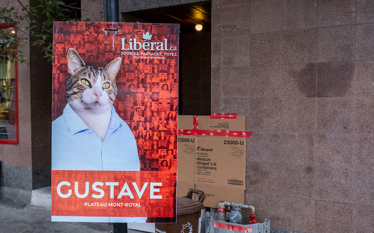 Le café Chat l’heureux a eu l’excellente idée de proposer ses propres versions des pancartes électorales pour les prochaines élections fédérales, avec des têtes de chat à la place des horribles visages photoshopés des candidats humains.