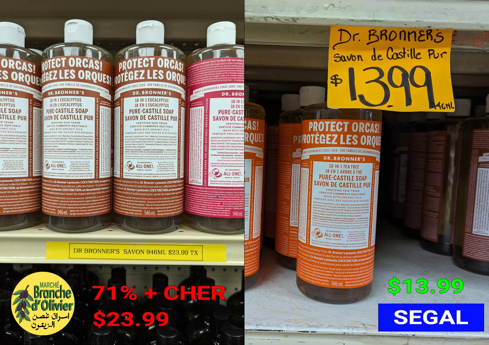 Le savon Dr. Bronner’s 946ml est venu au prix de $13.99 à Segal, contre $23.99 à la Branche d’Olivier, soit une augmentation de 71%.