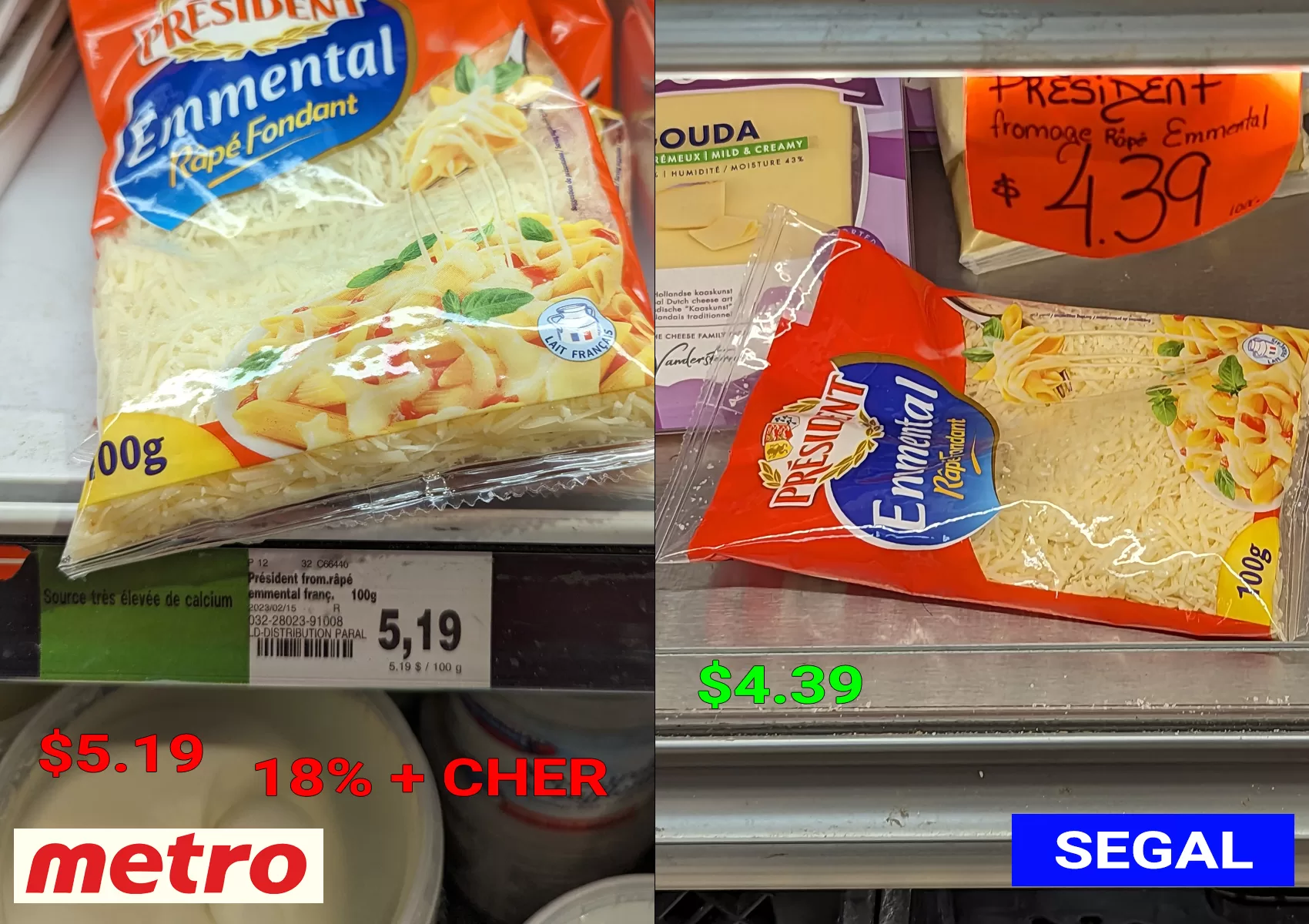 Le sachet de 100g d’Emmental Président est 18% plus cher à Métro qu’à Segal ($5.19 vs $4.39).