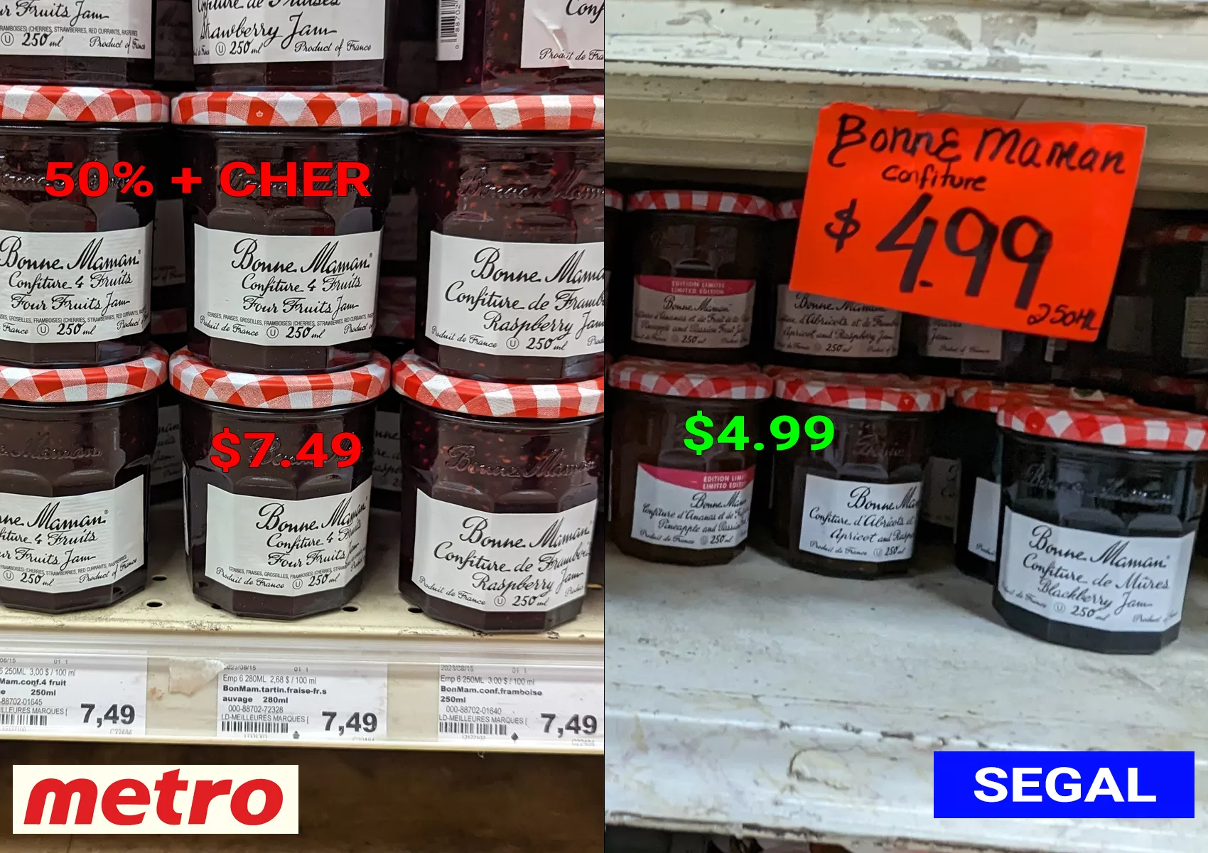 Du côté des confitures Bonne Maman, on a un prix 50% plus cher à Métro par rapport à Segal, $7.49 contre $4.99!